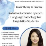 Dr. Kim was invited to give a talk at Ewha University located in Seoul, South Korea. The talk introduced Speech Language Pathology to students majoring in Linguistics.